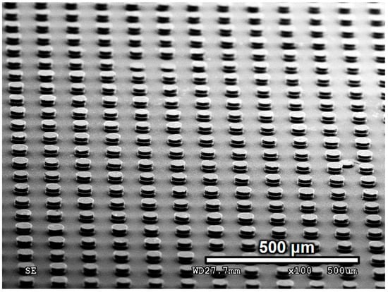 First, a 30 nm Cr adhesion layer was deposited onto a 4 in glass wafer, followed by a 200 nm Cu seed layer. Then, a 15 μm dry film photoresist layer (RY-3315EE, manufactured by Hitachi Chemical, Tokyo, Japan) was hot-rolled onto the wafer. The photoresist was patterned by UV light exposure and developed in a 1% sodium carbonate solution. After patterning, the wafer underwent electroplating to produce pillars with a height of 17 ± 2 μm. The pillar diameter was approximately 50 μm, with a pitch of 100 μm. Finally, the wafer was diced into 8 mm × 8 mm dies.