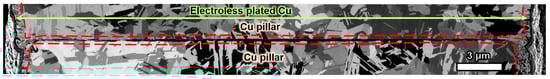 Figure 10 shows a cross-sectional view of the bonded pillars following a 7 min electroless Cu plating process at 35 °C. The surfaces of the electroplated and electroless-plated copper showed a distinct variation in grain size. The growth of electroless-plated copper around the edges of the pillars hindered the movement of the copper ions toward the center, causing voids between the pillars. Similar issues have been highlighted in previous studies [9,39] and can be resolved by adopting dome-shaped pillars instead of flat-topped pillars [9].