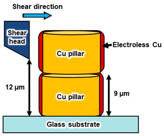 To assess the bond strength of the joined connections, a bond tester was used to conduct tests on 16 samples of bonded pillar pairs. The shear speed was 10 μm/s, and the shear height was set at 12 μm above the substrate, positioned in proximity to the upper region of the joint, as illustrated in Figure 11. The results revealed a 100% fracture at the jointed section, specifically at the interface between the electroless Cu-plated layer and the Cu pillar. The average fracture strength of the electroless Cu bonds was measured at 76 MPa, surpassing the values reported for electroless copper bonding in the literature (18–36 MPa) [40]. Additionally, it slightly exceeded the fracture strengths of SAC305 (59 MPa) and SnPb (65 MPa) solder joints [41]. These findings underscore the robustness of the electroless-Cu-bonded interconnections utilizing the copper–quadrol complex solution, indicating their suitability for practical applications.