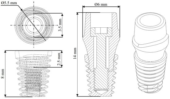 The characteristics of the implant were taken based on the anatomy of a lower first molar, so the dimensions were considered and compared according to catalogs of commercial manufacturers (Straumann (Basel, Switzerland), Avinent (Santpedor, Spain), Nobel Biocare (Kloten, Switzerland)). Therefore, and according to the proposal, a two-piece dental implant was selected with an internal conical hexagonal connection joined by a screw. The dimensions of the dental implant are 14 mm in length and a diameter of 6 mm (Figure 1). In addition to this, and according to the research literature, the average chewing force of a human being is 300–450 N, and the maximum that can be reached in healthy conditions is 450–550 N, with bruxism up to 850 N [28,51,52].
