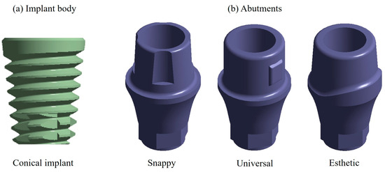 The model of the dental implant was developed using the SolidWorks computer program. For the modeling of the dental implant, designs of commercial manufacturers were used. In the case of the dental implant body, a conical geometry was chosen (Figure 2a) because of a better grip; for the abutment, three different designs were chosen, which were all joined by a prosthetic screw developed by the Swiss company Nobel Biocare (Kloten, Switzerland), called Snappy abutment, Universal and Esthetic (Figure 2b).