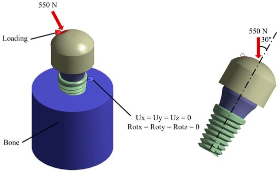 According to the anatomy of the tooth, the boundary conditions were placed in the bone zone restricting the six degrees of freedom including displacements in Ux, Uy, and Uz and rotations in Rx, Ry, and Rz. On the other hand, the loading conditions were placed in the upper part of the spherical member, and the direction of the load was placed based on the ISO 14801 standard that mentioned applying the load at an angle of 30° with respect to the vertical of the implant. For the magnitude, the maximum chewing force of a healthy person was taken as a reference, which is 550 N (Figure 3) [58,59].