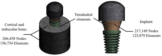 The models presented above were evaluated by means of the finite element method using ANSYS Workbench (ANSYS, Inc., San Diego, CA, USA) as a computer program. For the analysis, a fine discretized with tetrahedral elements and a maximum element size of 0.2 mm was used, giving an average total of 483,607 nodes and 282,633 elements among the three different models (Figure 4). The behavior of the dental implant model was considered linear, homogeneous, and isotropic, although it should be clarified that the behavior of the cortical and trabecular bone area was considered with orthotropic properties.