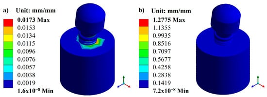Total unit deformation for the Snappy abutment: (a) titanium and (b) CFR-PEEK.