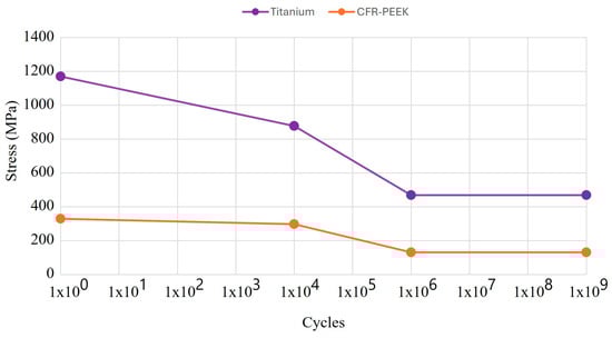 S-N curve of fatigue behavior of titanium and CFR-PEEK.