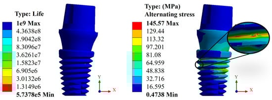 For the fatigue analysis, the S-N curve, also known as the Wöhler curve, was used, which is a graph that represents the fatigue behavior of a material, where the number of cycles is on the abscissa axis and stress is on the ordinate axis, both generally on a logarithmic scale (Figure 10) [60,61]. In addition, two parameters that the authors consider relevant were taken into account for the results. One is the life cycle, which indicates the failure of the material due to repeated loads (the useful life of the material). The other is alternating stress, which is a relationship between the maximum and minimum effort that acts on the dental implant and works as a metric with respect to the fatigue limit of the material, so it must be kept in the high-cycle zone to avoid failure.