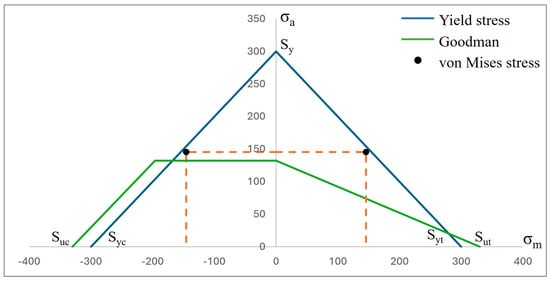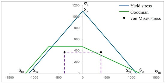 Complementing the above results, two graphs are presented where the fatigue behavior of both biomaterials can be observed (Figure 13 and Figure 14). This is with respect to the following two failure criteria: one is by Godman and the other is the fatigue strength criterion for negative mean stresses. In this sense, as mentioned above, titanium, due to its high rigidity, proved to be more resistant, although CFR-PEEK showed better mechanical behavior because of the fact that the value of the alternating stress is lower than that of titanium. However, the safety factor is below unity, with a value of 0.90 with respect to the value of 1.25 of titanium, which clearly indicates that the polymer will fail.
