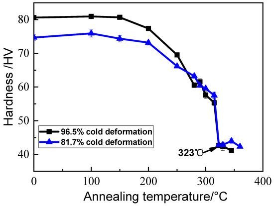 In order to determine the recrystallization finishing temperature of the two samples with 96.5% and 81.7% thickness reductions, their micro-hardness was measured as a function of the annealing temperature in the range of 100 to 360 °C for 1 h. The results are shown in Figure 1. It can be seen that with increasing the annealing temperature, the micro-hardnesses were almost unchanged at temperatures lower than 200 °C. Then, the micro-hardnesses decreased slowly between 200–315 °C, which indicates that the samples underwent recovery. The micro-hardnesses fell rapidly from 315 °C, then levelled off after about 323 °C, indicating that recrystallization occurred. Hence, the recrystallization finishing temperatures were determined to be 323 ± 2 °C for both samples, which was in good agreement with other reports [23,25]. The increase in cold-rolling reduction from 81.7% to 96.5% had no significant effect on the recrystallization finishing temperature.