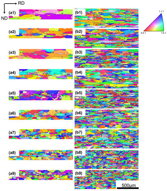 The two samples with different cold-rolling reductions were recrystallized at various annealing temperatures ranging from 330 to 550 °C, i.e., higher than the recrystallization finishing temperature, to ensure that the samples were in a finished recrystallization state. Figure 2 shows the EBSD inverse pole figure (IPF) maps of the two samples annealed at various temperatures for 1 h. The EBSD images show that these samples were recrystallized completely. As seen in Figure 2(a1), there were quite a few large recrystallized grains in the 96.5% cold-rolled sample when the annealing temperature was 330 °C and the grain shape was elongated along the RD direction. With increasing the annealing temperature to 400 °C, the number of grains increased obviously and the grain size decreased along the RD and ND directions (Figure 2(a2–a5)). Further increasing the annealing temperature to 550 °C did not change the grain size much (Figure 2(a6–a9)), but the grains tended to become quasi-equiaxed. It is worth noting that the size of the grains at the surface of the sample was much larger than that of the internal grains.