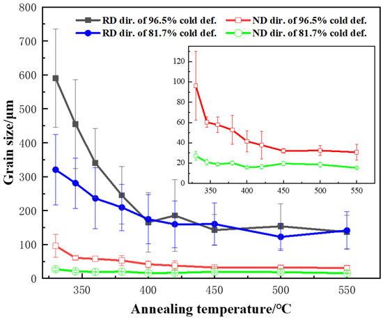 Similarly, the variation in grain sizes with annealing temperature for the 81.7% cold-rolled sample showed a significant decrease in grain size in the temperature range of 330–400 °C, but remained almost the same in the temperature range of 400–550 °C, as shown in Figure 2.