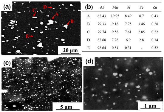 In order to clarify the above abnormal change in grain sizes with annealing temperature, the microstructures of the precipitated phase and recrystallized grains were examined in detail. The sample with 96.5% cold-rolling reduction that showed the largest decrease in grain size was selected in order to examine its microstructure before and after the annealing treatment using SEM and TEM. Figure 4 shows the SEM images at various magnifications and the local composition results obtained from the energy dispersive X-ray spectrometry (EDS). As shown in Figure 4a, a large number of coarse primary-phase particles with sizes between 0.2 μm to 5.4 μm were observed in the form of thick sticks with an irregular shape. The compositions of these primary-phase particles mainly consisted of Al–Mn–Fe–Si, as shown in Figure 4b. In Figure 4c,d, the images are shown at higher magnifications to demonstrate densely dispersed small second-phase particles with an average diameter of 32 ± 10 nm.