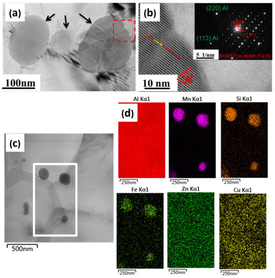 The small particles were examined using TEM. Figure 5a shows the spherical particles and the leaf-like stripes on a particle, marked with a red square. Figure 5b is a high-resolution TEM (HRTEM) image from the red square region in Figure 5a, showing a lattice image of the particle. The spacing of the lattice fringes is 1.2 nm, which corresponds to the interplanar d-spacing of plane (100) in the α-Al(Mn,Fe)Si structure [30]. The leaf-like stripes in the particle were attributed to the mismatch of atomic planes and dislocations caused by the cold rolling. A selected-area electron diffraction pattern (SADP) of the Al matrix and the precipitate in the red square in Figure 5a is shown in the inset of Figure 5b, proving that the precipitate was the α-Al(Mn,Fe)Si phase, consistent with the elemental mapping results using energy-dispersive X-ray spectroscopy (EDS) in Figure 5c,d.
