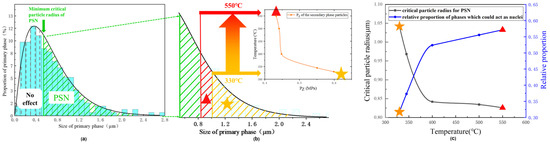 (a) The distribution of the primary-phase and their effect on recrystallization. (b) The relationship between the temperature and the critical particle radius. (c) The critical particle radius (black) and the percentage of primary-phase particles (blue) that could act as the nuclei as functions of the annealing temperature.