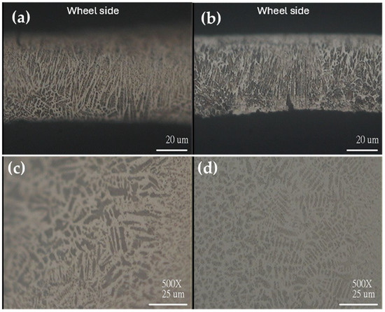 The grain growth within the as-spun ribbons was affected by the melt spinning process, in which the rapidly chilled wheel side (of the ribbon) in contact with the wheel surface contained fine grains.