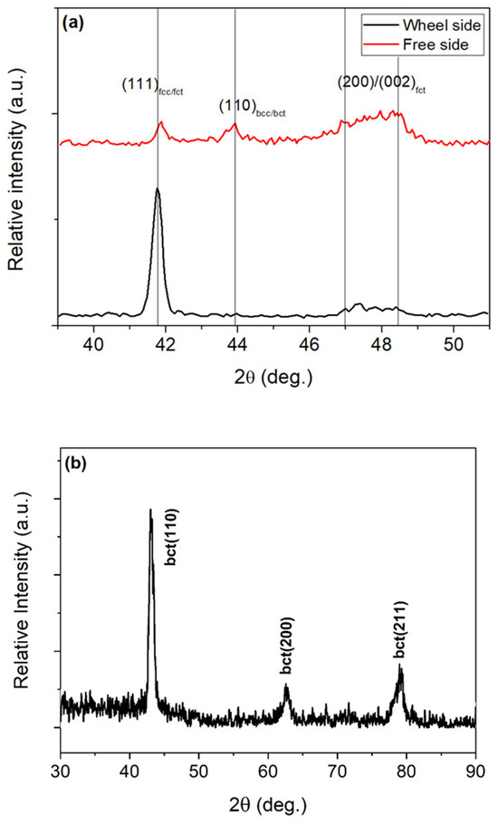 Figure 2a shows the XRD patterns of the as-spun ribbon (S), registered from either the wheel or the free sides at room temperature. As the wheel side of the ribbon was chilled faster than the free side, it influenced the presence of the non-thermoelastic bct martensite (110). XRD shown in Figure 2a indicates a small amount of bct martensite on the ribbon’s free side, whereas on the wheel side the XRD pattern does not show any distinct peak belonging to the bct martensite. Importantly, both sides of the ribbon exhibited the (200)/(002) split associated with fct martensite, indicating that the Ms temperature is above room temperature. Figure 2b shows the XRD pattern of the annealed ribbon (A). The pattern is sharply different compared to the as-spun ribbon and there is no difference between the XRD patterns taken from either side of the ribbon. The pattern corresponds to the bct martensite. This means that the chosen annealing resulted in the structural change from fcc/fct to bct martensite present at room temperature. This martensite is not thermoelastic and is stable in a large temperature range confirmed by optical microscopy observation.