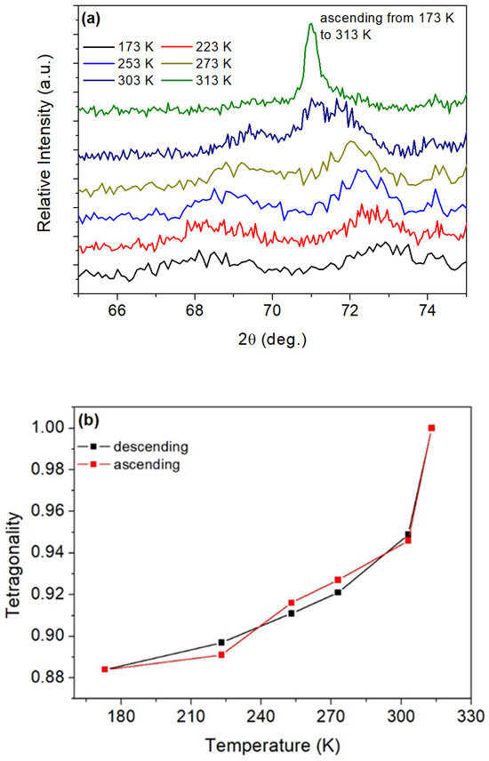 The XRD patterns of the free side of ribbon S were measured at various temperatures. On cooling, the fcc (111) diffraction peak (registered at 371 K) gradually shifted towards a higher angle and broadened as the material transformed to the fct martensite, whereas (200) and (220) fcc peaks each split into two separate peaks. Figure 3a shows, in detail, the splitting of the (220) peak with decreasing temperature. The broadening and peak splitting is an indication of the presence of the fct martensite. The tetragonality gradually changed during cooling/heating and reached a value of 0.88 at a temperature of 173 K (Figure 3b). The figure indicates a good reversibility of the fcc-fct martensitic transformation with a narrow hysteresis. The lattice parameters of Fe67.6-Pd32-In0.4 calculated based on the X-ray diffraction patterns were determined as follows: a50 = 0.3754 nm (austenite), a-100 = 0.3881 nm, c-100 = 0.3431 nm (fct martensite), and aRT = 0.2912 nm (bcc martensite). The subscripts in the parameters denote temperature. The values reported above for Fe67.6-Pd32-In0.4 are close to the lattice parameter values of the corresponding phases of the neat Fe-Pd SMAs [7,13,44,45,46].