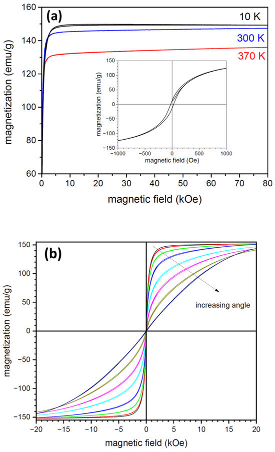 Magnetization curves of ribbon S: (a) at three temperatures (10, 300, 370 K) and a maximum magnetic field of 80 kOe, the in-plane direction was measured along the ribbon axis, inset with the detail of the magnetization (hysteresis) curve at low field measured at room temperature; (b) magnetization curves at room temperature for different angles between the ribbon plane and magnetic field. The angle increases as marked by arrow (curves for 0, 15, 30, 45, 60, 70, 80, 90 degrees).