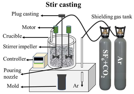 The alloys were produced using a stir-casting technique as illustrated in Figure 1. Initially, the base material and reinforcement were placed into the crucible furnace. When the temperature reached 400 °C, a mixture of SF6 + CO2 gas was added to prevent burning. Subsequently, the temperature was raised to 600 °C using Ar gas to prevent oxidation. Once the temperature reached 760 °C, it was held for ten minutes. Following this, the mixture was stirred rapidly for 20 min at 250 rpm to disperse the reinforcement particles. After completing the stirring process, the plunger was raised to allow the molten metal to flow into the mold. The material was then extracted and left to solidify through natural air cooling. Finally, the last casting was removed, and the mains power supply was shut down [23]. Two different types of cylindrical ingots were prepared using the same method and fabrication process: 1) AZ61 and 2) AZ61 + 4% Zn.