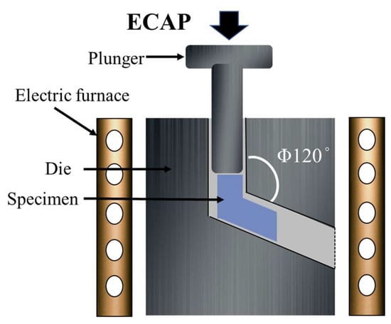 In this study, we employed the T4 solid solution treatment to fabricate our specimens. Initially, the samples underwent a 24 h heat treatment at 380 °C to achieve a specific solid solution effect. Subsequently, the treated specimens were directly quenched at room temperature to ensure the integrity of the heat-treatment process. The purpose of this heat-treatment procedure is to tailor the material’s crystal structure and mechanical properties to meet the requirements of our research. Following the heat treatment, the ECAP fabrication process (Figure 2), was carried out on a preheated mold of the ECAP device at 350 °C for 40 min. Subsequently, a single pass of ECAP was conducted with a channel angle of 120 degrees and a pressing speed of 20 mm/min.