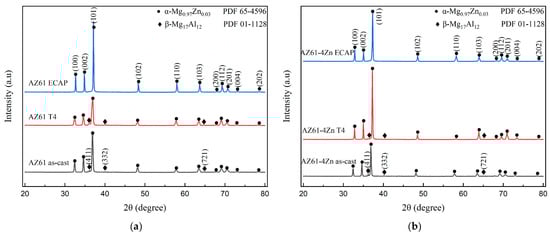 Figure 3 illustrates the X-ray diffraction (XRD) analysis of AZ61 alloy (Figure 3a) and AZ61 + 4 wt.% Zn alloy (Figure 3b). XRD peaks corresponding to the α- Mg0.97Zn0.03 phase and β-Mg17Al12 phase are observed in both as-cast AZ61 and AZ61 + 4 wt.% Zn. No zinc containing phase is detected, as zinc has a certain solid solubility in magnesium and thus exists in the form of Mg0.97Zn0.03 [24]. In the XRD patterns within the 2θ range of 30°–45°, a noticeable decrease in the intensity of β-Mg17Al12 phase XRD peaks (411), (332) is observed after T4 heat treatment for both AZ61 and AZ61 + 4 wt.% Zn alloys. Moreover, after undergoing ECAP with one pass, only the α—Mg0.97Zn0.03 phase was observed, indicating homogenization and dissolution of the β-Mg17Al12 phase during the ECAP process. It is worth noting that this dissolution phenomenon may be attributed to the ECAP process and to heat treatment prior to the ECAP process. These XRD results align with the observations from optical microscopy (OM), as depicted in Figure 4.