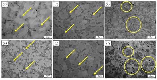 Optical microscopy microstructures of (a) AZ61-as-cast, (b) AZ61-T4, (c) AZ61-ECAP, (d) AZ61 + 4 wt.% Zn-as-cast, (e) AZ61 + 4 wt.% Zn-T4, and (f) AZ61 + 4 wt.% Zn-ECAP. The yellow arrows indicate phase particles, including β phase particles and Mg-Zn phase particles. The yellow circles indicate areas of grain refinement.