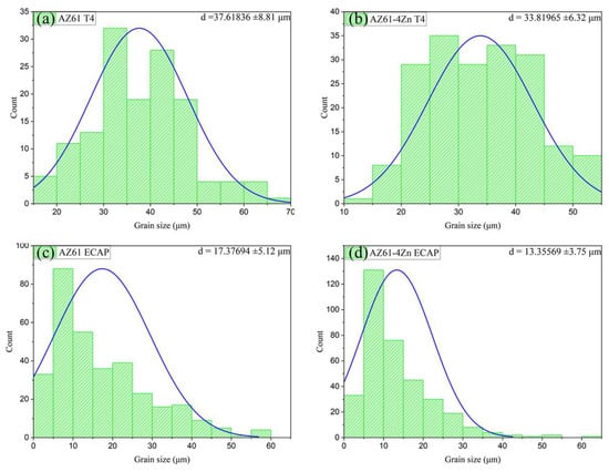 Grain size distribution of (a) AZ61-T4, (b) AZ61 + 4 wt.% Zn-T4, (c) AZ61-ECAP, and (d) AZ61 + 4 wt.% Zn-ECAP.