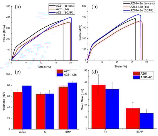 Stress–strain curves of (a) AZ61 and (b) AZ61 + 4 wt.% Zn; (c) Vickers hardness; and (d) Average grain size.