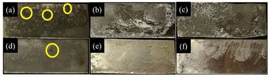 The results of salt spray tests are depicted in Figure 8. Figure 8a shows poor corrosion resistance on the surface of AZ61-as-cast, with uneven surface corrosion and numerous corroded pits (highlighted by yellow circles). Figure 8b,c displays the uneven corrosion on AZ61 after T4 heat treatment and ECAP. Figure 8d–f shows specimens of AZ61 + 4 wt.% Zn after different processing steps. With the addition of 4 wt.% Zn, the corrosion area becomes more uniform, with only a few corroded pits observed in Figure 8d AZ61 + 4 wt.% Zn-as-cast. The best corrosion resistance is observed in Figure 8f for AZ61 + 4 wt.% Zn after ECAP, with a majority of the surface remaining uncorroded and exhibiting a bright appearance.