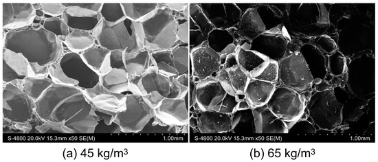 To optimize the experimental parameters, we scanned the PMI foam using a Scios focused ion beam field emission scanning electron microscope (Scios, FEI Czech Co., Ltd., Brno, Czech Republic). Figure 2 shows that the PMI foam core layer had a high number of closed cells. The foam cells with a density of 45 kg/m3 were large, with an average diameter of ~533 μm, while those with a density of 65 kg/m3 were slightly smaller and exhibited a more uniform size, with an average diameter of ~466 μm.