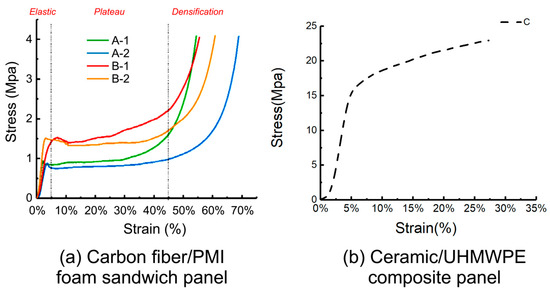 To compare the responses of the carbon fiber/PMI foam sandwich panel and ceramic/UHMWPE composite panel under quasi-static loading, the material was tested using an INSTRON 5982 universal mechanical testing machine (Instron Corporation Norwood, MA, USA) following the standard ISO 844 [35]. The stress–strain curve of the specimen was obtained at room temperature at a compression rate of 1.25 mm/s.