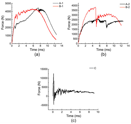 Force–time curve of specimens under low-speed impact: (a) force–time curves of specimens A-1 and B-1; (b) force–time curves of specimens A-2 and B-2; (c) force–time curves of specimen C.