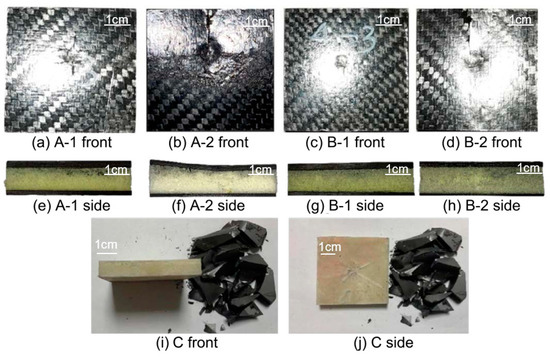 Impact damage images of the specimens are shown in Figure 7. The foam core layers of A-1 and B-1 had almost no change, and only slight dents appeared on the panel, with the average dent sizes of A-1 and B-1 being 0.41 ± 0.05 mm and 0.33 ± 0.09 mm, respectively. After being impacted by the hammer head, the panels of A-2 and B-2 both showed vertical cracks, and the deformation of the foam core layer could be observed from the side, with the average dent sizes of A-2 and B-1 being 0.62 mm and 0.77 mm, respectively. The damage to specimen C was specifically manifested as the crushing of the ceramic layer and the impact dent of the UHMWPE layer; the dent width of the UHMWPE layer was 17 mm, showing a star-shaped diffusion. However, no distinct side deformation was observed.