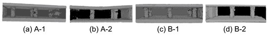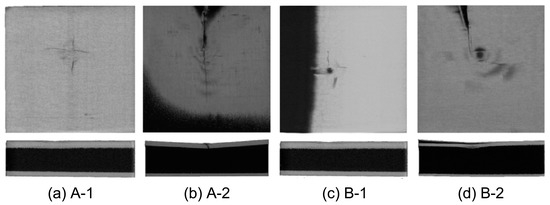 Figure 8 shows the damage to the face and core layers obtained using CT. In the scanned image, the cracking of the face layer panel can be observed more explicitly. The face layer of the material was damaged at the impact point, whereas the back layer remained intact. The face layers of specimens A-1 and B-1 were thicker, and the impact damage was smaller, which was reflected as a small cross-shaped dent, and small radial cracks appeared from the dent. The face layer panels of specimens A-2 and B-2 were thinner, and longer straight cracks appeared. Owing to the inclination deformation of the specimens, shadows appeared in the plane scanning images. From the perspective of core layer deformation, the core layers of specimens A-1 and B-1 hardly changed, whereas the panels of specimens A-2 and B-2 showed delamination and fracture, among which that in the central part hit by the hammer head was the most severe. The average dent depths of specimens A-2 and B-2 were 1.84 and 1.61 mm, respectively.