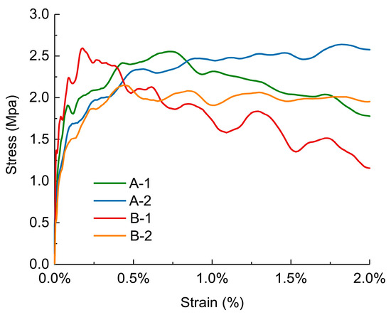 As shown in Figure 4a, the elastic stage lengths of the specimens were similar, occurring at the strain stage from 0 to 4%, and the 60 kg/m3 foam specimens (B-1, B-2) had a relatively longer elastic stage. This is because the extensibility of the foam edges and walls determines the elastic stage length. The foam with a density of 60 kg/m3 had smaller chambers, thicker foam walls, stronger ductility, and therefore a longer elastic stage [41,42]. The cell edges in the foam that deformed locally squeezed each other as the instrument loaded further, the cell walls bent and wrinkled, the foam partially collapsed, and the stress–strain curve slightly decreased. The curve rose and entered the plateau stage as the cells broke, the gas inside the cells escaped, and the pore gas became compressed. The material maintained a stable stress value while experiencing large-scale deformation at this stage, which shows that the foam material sandwich panel has good energy absorption capacity [40].