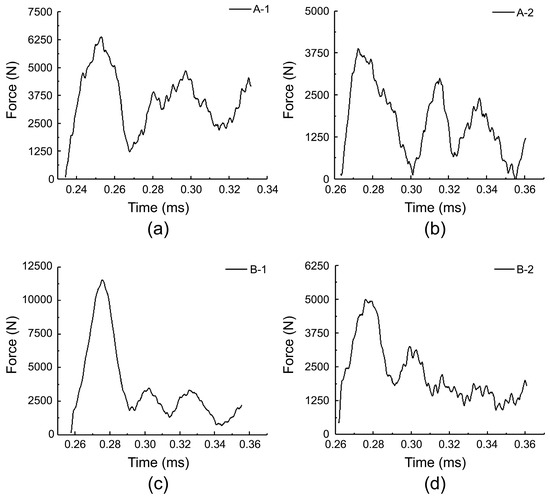 Force–time curves obtained under high-speed compression: (a) A-1; (b) A-2; (c) B-1; (d) B-2.
