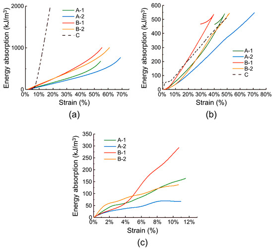 Energy absorption curves of the specimens: (a) quasi-static compression; (b) low-speed impact; (c) high-speed impact.