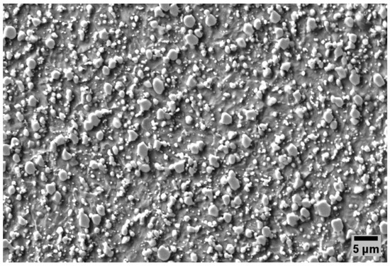 The as-received (annealed) microstructure of Vanadis 6 PM steel contains the matrix (ferrite) and spheroidized carbides, as shown in Figure 1. The initial (as-received) hardness was 278 HV10.
