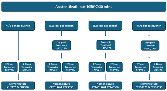 The samples were subjected to vacuum heat treatment that consisted of heating to the austenitizing temperature (1050 °C), holding at this temperature for 30 min, and nitrogen gas quenching (5 bar). The detailed heat treatments used in this study are shown in Figure 2.