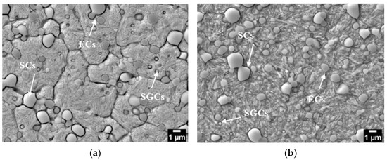 Both microstructures comprise martensite, some residual austenite (γR) (although this phase is nearly eliminated in the CT140530 specimen), and three distinct types of carbides. Recently, thorough analyses of carbide phases in cryogenically treated Vanadis 6 steel were conducted using transmission electron microscopy (TEM) (Jeol Ltd., Tokyo, Japan) [12]. They revealed the prese nce of vanadium-based eutectic MC carbides (ECs), mixed chromium/iron-rich secondary carbides (SCs, M7C3), and small globular carbides (SGCs, M3C) in the steel after subjecting it to cryogenic treatments at −140 °C, as shown in Figure 4. Furthermore, the qualitative microstructural features identified are similar to those of other CTs and Tps used in this study; thus, only one CT micrograph is referenced here. The used treatment schedules do not alter the population densities of ECs and SCs, as previously reported [20,21,22], while varying the population density of SGCs. Figure 5 summarizes the amounts of γR and population densities of SGCs in the specimens subjected to different heat treatments.