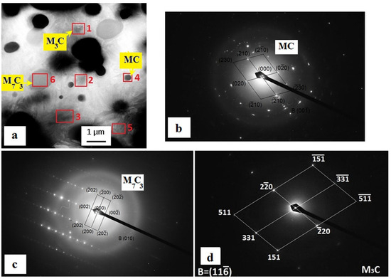 TEM micrograph (a) showing the microstructure of Vanadis 6 steel subjected to SZT for 17 h, and (b–d) diffraction patterns of MC, M7C3, and M3C carbides indicated in the micrograph. Adapted from recently published results on microstructural analyses of cryogenically treated Vanadis 6 steel [12].