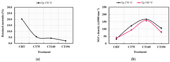 When comparing the microstructure of specimens treated with cryogenic treatment (CT) and conventional treatment (CHT), two main observations can be made. First, the comparison of the amount of retained austenite in CT and CHT specimens shows that CT tends to reduce the γR content considerably. The CT temperature of −196 °C is the most effective at reducing the γR content among the CT temperatures used in this study, as shown in Figure 5a.