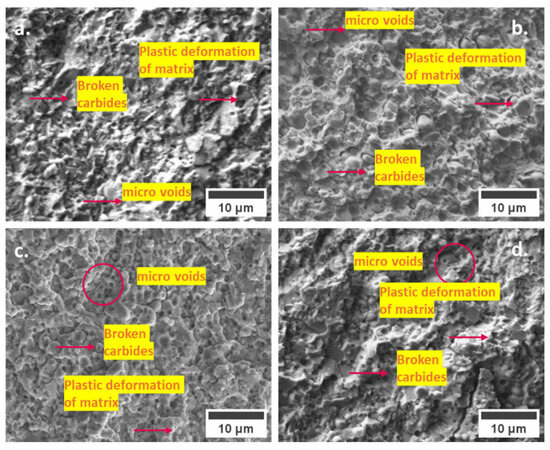 SEM microstructure of fracture surfaces of Vanadis 6 steel tempered at 530 °C: (a) CHT, (b) CT75, (c) CT140, and (d) CT196.