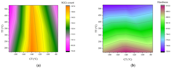 Contour plots: (a) treatment vs. small globular carbides (×1000−2) and (b) treatment vs. hardness.