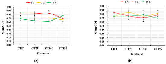 Mean coefficient of friction as a function of load for different treatments: (a) tempered at 170 °C and (b) tempered at 530 °C.