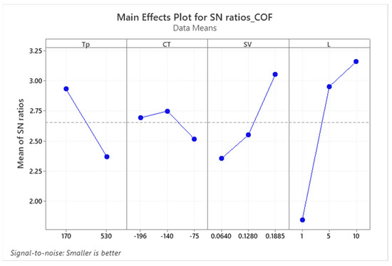 Main effects plot for SN ratios of coefficient of friction (COF).