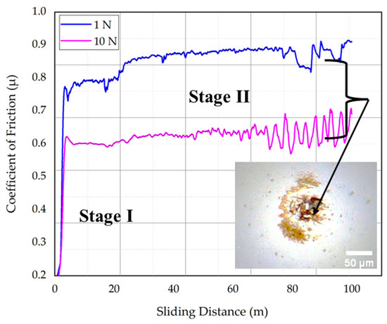 Figure 12 illustrates the sliding distance dependence of the COF values for two representative specimens: CT140170 tested at 10 N (optimum condition) and CT75530 tested at 1 N (worst condition).