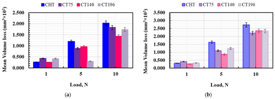 Furthermore, the charts demonstrate that, under increasingly severe tribological conditions, cryogenic treatments result in lower volume losses compared to CHT specimens. Within the cryogenic treatments, −140 °C cryogenic treatment, followed by low-temperature tempering, yields the lowest volume loss compared to other treatment routes used in the present study, as shown in Figure 13a. This processing approach, therefore, holds significant potential for enhancing the wear performance of Vanadis 6 steel. For instance, at low-temperature tempering, CT140 treatment demonstrates −3%, −20%, and −30% lower volume loss compared to CHT specimens at 1 N, 5 N, and 10 N applied loads, respectively. When tempered at 530 °C, cryogenic treatments also led to a lowering of volume loss, but the effect of CT temperature is insignificant at 10 N load, as shown in Figure 13b.