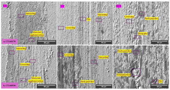 Figure 15 displays scanning electron (SEM) micrographs illustrating the worn surfaces of CT140 specimens post-tempering at 170 °C and 530 °C under varying tribological conditions. Irrespective of the treatment strategy or testing conditions employed, the worn surfaces consistently manifested a rough, shiny, and metallic appearance. Distinctive features included parallel grooves aligned with the sliding direction, alongside pits of varying depths. Furthermore, the SEM analysis revealed the presence of smeared steel material in the form of agglomerates, predominantly situated along the sides of all wear tracks, along with occasional dark patches.