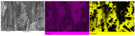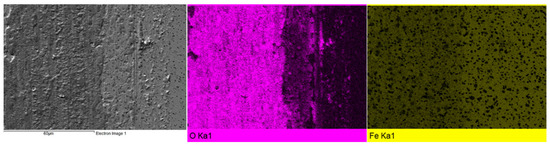 SEM−EDS maps of oxygen and iron in the wear track of the CT140170 sample developed by the dry sliding of alumina under a load of 1 N.