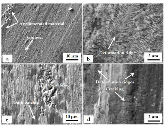 The wear tracks of the CT196530 sample that was tested under a 10 N load manifested a great number of dark patches. Also, clear indications of surface delamination and the presence of deep pits were observed, as shown in Figure 18c. A detailed SEM image in Figure 18d reveals that surface delamination takes place only after the plastic deformability of the close-to-surface material is exhausted. In other words, the material is first deformed plastically, then the first microcracks are formed, and, after their accumulation, the deformed material is removed from the surface.